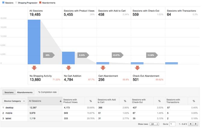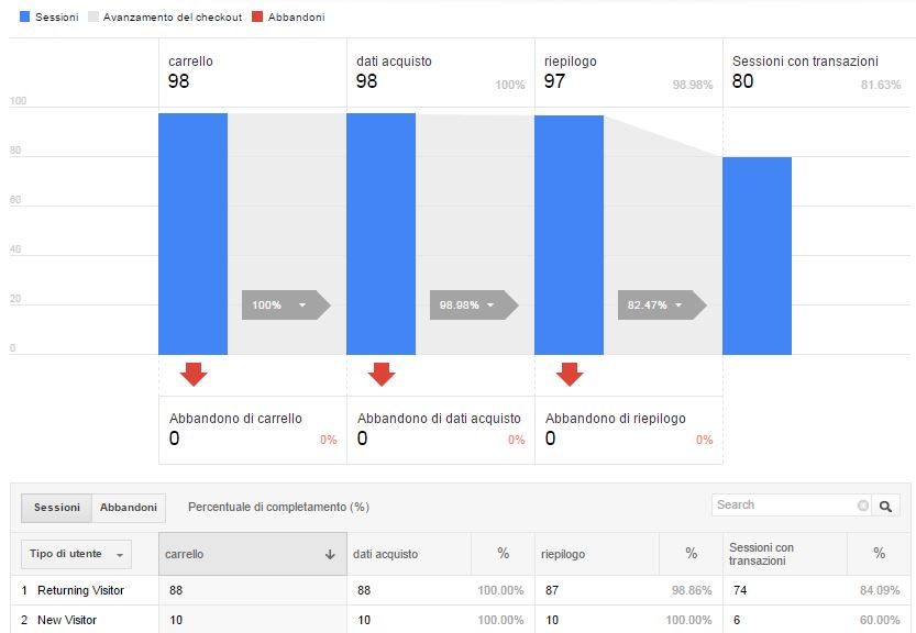 Tutte le Sessioni => sessioni con visualizzazione di prodotti => sessioni con aggiunta al carrello => sessioni con procedura di pagamento => sessioni con transazioni.