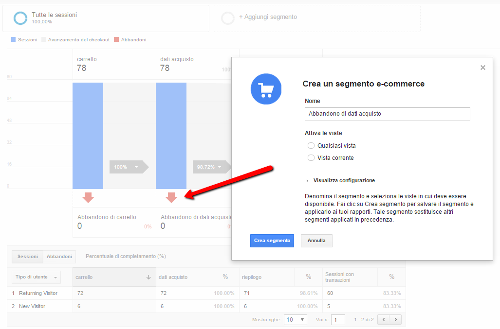 Nell'esempio sotto, ho creato un segmento per gli utenti che hanno passato il primo step del carrello ma sono usciti prima di compilare i dati personali: