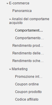 Oltre al rendimento dei prodotti, è importante misurare le attività di marketing interno ed esterno con cui promuovi tali prodotti. Alla voce "Marketing" troverai 4 rapporti relativi al rendimento delle tue promozioni interne (banner che rimandano in un altra sezione del sito) e dei tuoi coupon.
