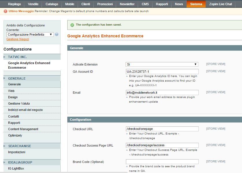 Una volta installato il Plugin, non dovrai fare altro che andare dalla tua bacheca Magento alla voce Sistema => Configurazione. Inserisci il codice Universal Analytics e l’Url delle pagine Checkout e Success Page.