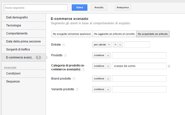 segmento avanzato ecommerce google analytics