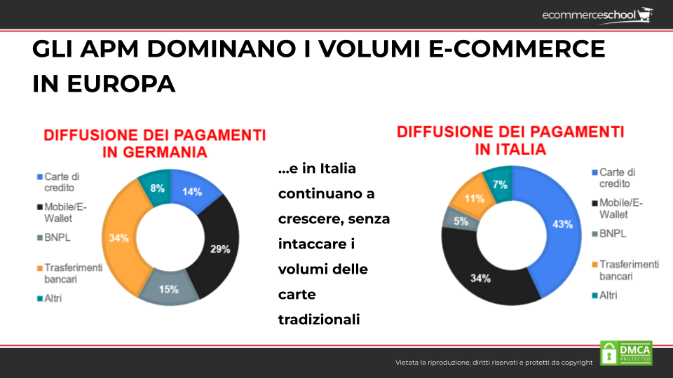 Per comprendere meglio l’importanza dei metodi di pagamento alternativi, prendiamo in considerazione il caso della Germania. In Germania, i pagamenti con carta di credito rappresentano solo il 14% delle transazioni online, mentre il 29% è costituito dai mobile wallet come Google Pay e PayPal.