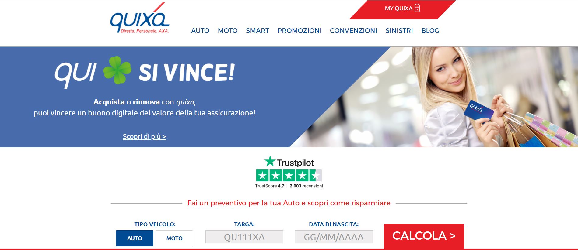 Infine questa homepage presenta finalmente una value proposition efficace. Il nome del brand “Quixa” è seguito da 3 caratteristiche fondamentali. Diretta, personale => vantaggi. Axa => fa parte del gruppo Axa.