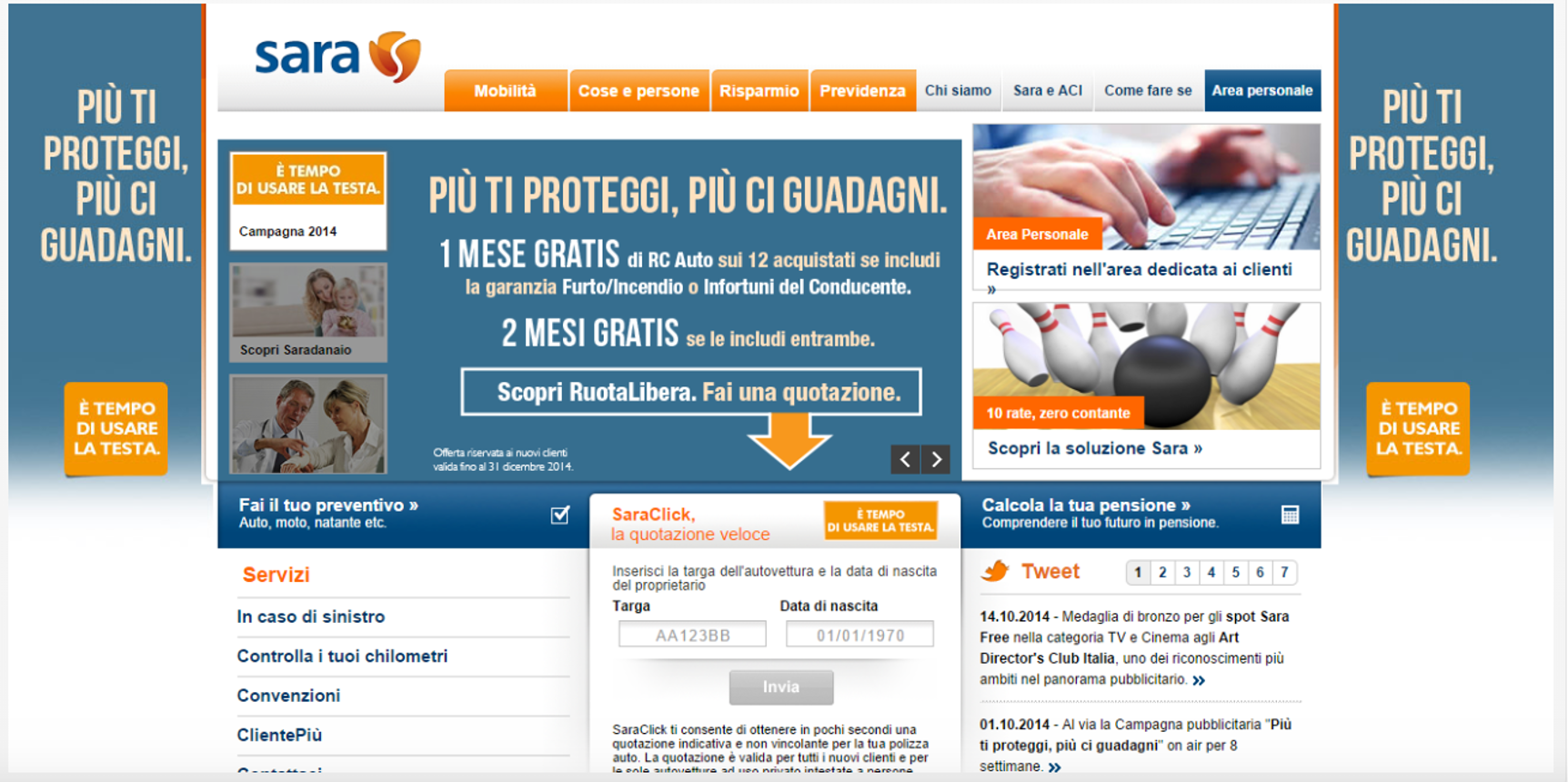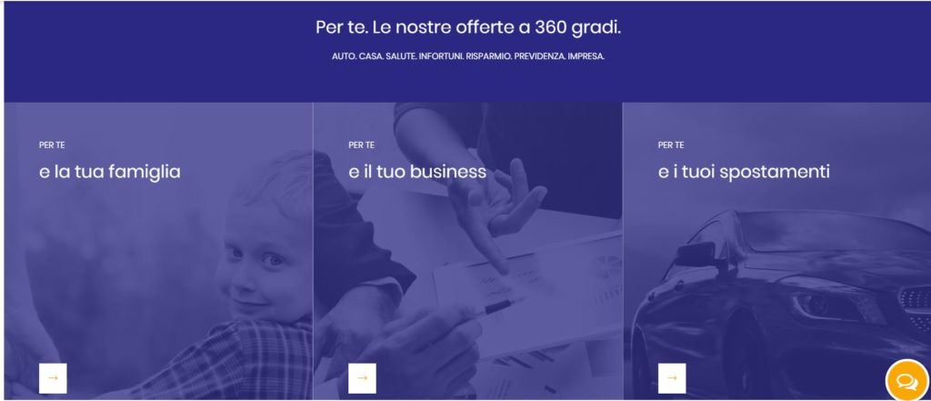In questa homepage le cose migliorano un po’. Il titolo “A ciascuno la sua protezione” ci dà un’idea di personalizzazione e della possibilità di poter avere una polizza che possa accompagnarmi nel corso della vita.