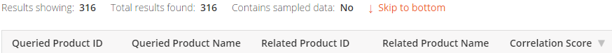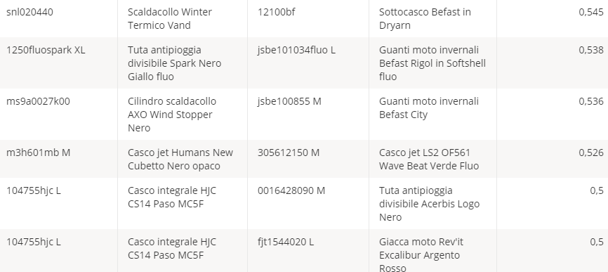 L’ultima colonna “Correlation score” indica la percentuale di volte in cui i due prodotti sono stati acquistati assieme.