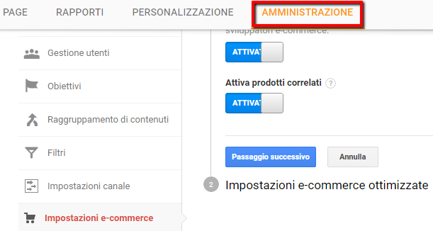 Tutto quello che devi fare è andare su Google Analytics e seguire il percorso: Amministrazione > Impostazioni Ecommerce > Attiva prodotti correlati.