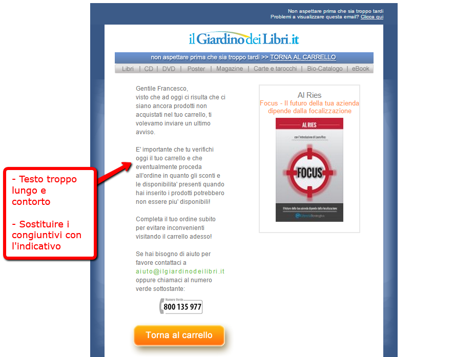 - Non essere prolisso. Devi solamente ricordare che il carrello con i prodotti è ancora lì a portata di mano. Utilizza frasi coordinate semplici ed evita subordinate e voli pindarici.
