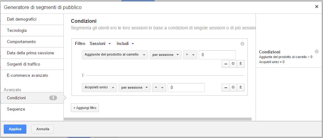 Potrai utilizzare quel segmento per creare una campagne Adwords mirate a ricondurre gli utenti al carrello e completare l'ordine.