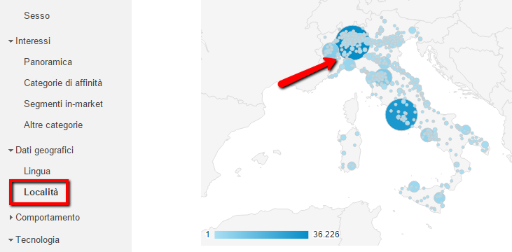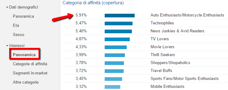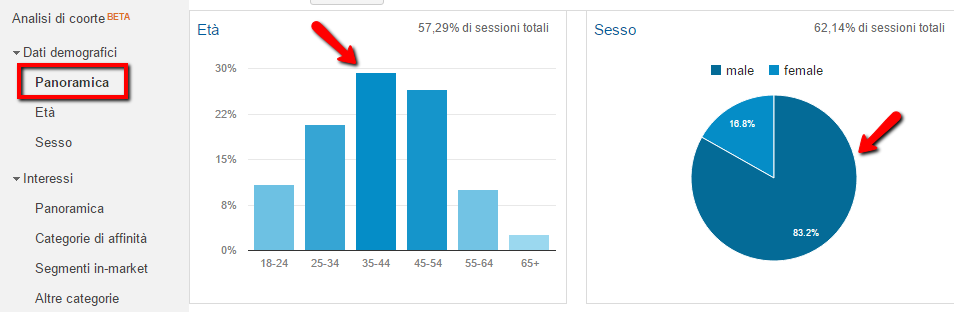 Google Analytics offre diversi rapporti molto utili per inquadrare gli utenti in macro-categorie. Proviamo una prima semplicissima operazione: navighiamo nei rapporti “Dati demografici”, “Interessi” e “Dati geografici” e segniamo i valori che si presentano più alti in termini di numero di sessioni.