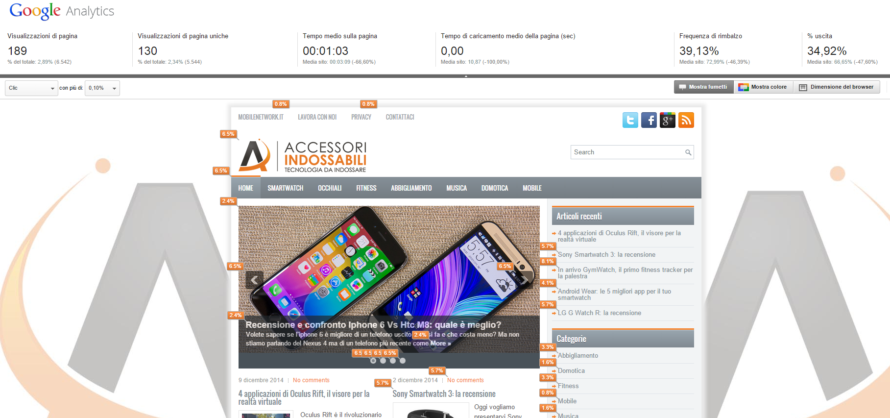 Di seguito una schermata dell'Analisi dati on Page del Blog accessori-indossabili.it :