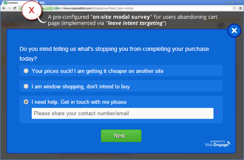 Qualcuno può obiettare che i sondaggi online possono essere fastidiosi o invasivi per i clienti, ma i dati che puoi ricevere dai clienti che non stanno comprando o che stanno uscendo dal sito sono davvero utili.