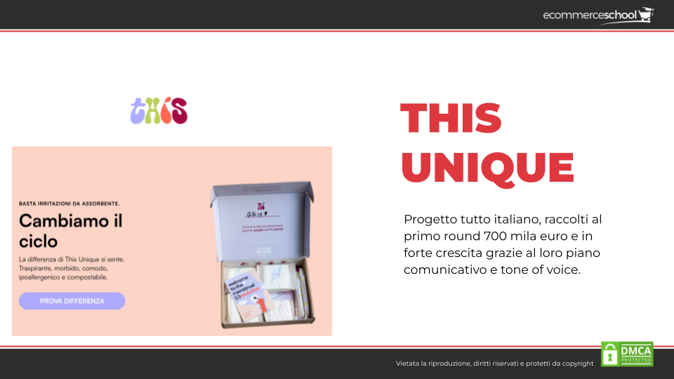 • This Unique, un progetto completamente italiano che ha raccolto al primo round 700 mila euro e che è in forte crescita grazie al proprio piano comunicativo e al TOV. Hanno forti valori e li comunicano con il Content Marketing. Vendono assorbenti in modalità di abbonamento e il rischio di ammorbare gli utenti, ma l’infoprodotto è presente sul sito, non realizzano contenuti sugli assorbenti ma basati sulla loro value propositon. Infatti, nel blog parlano di ecosostenibilità, inclusività, diritti delle nuove generazioni, diritti delle persone fragili, lavoro, comicità o comunque argomenti leggeri, personal care e molto, molto altro.