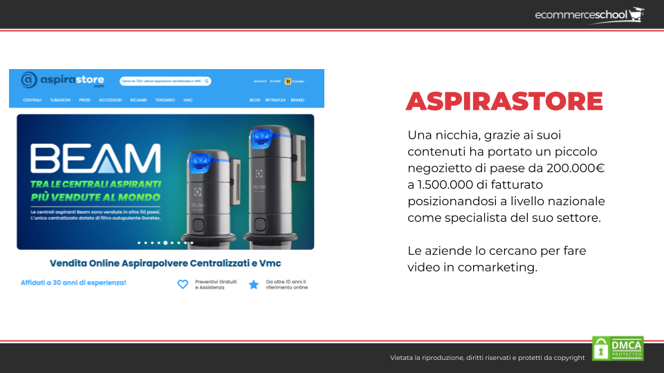 • Aspirastore, un ecommerce che opera in una nicchia molto ristretta, aspirazione centralizzata, ma che grazie ai suoi contenuti ha portato un piccolo negozietto di paese da 200.000€ a 1.500.000€ di fatturato posizionandosi a livello nazionale come specialista del settore. Oggi, le aziende lo cercano per fare video in co-marketing.