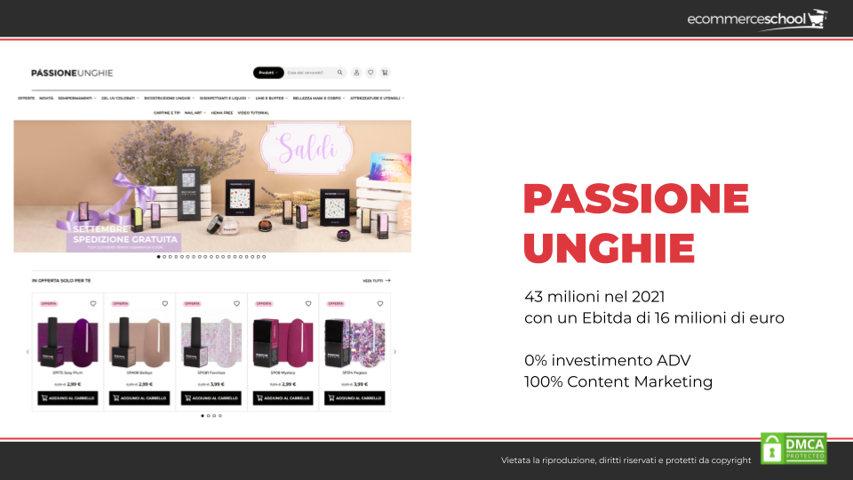 • Passione unghie, un ecommerce del settore nail che ha fatturato 43 milioni nel 2021 con un Ebitda di 16 milioni di euro, tutti senza investimenti in ADV e generati puramente dal Content Marketing. La logica di vendita tradizionale e a catalogo funziona sempre meno e la necessità di creare contenuti è sempre più forte.