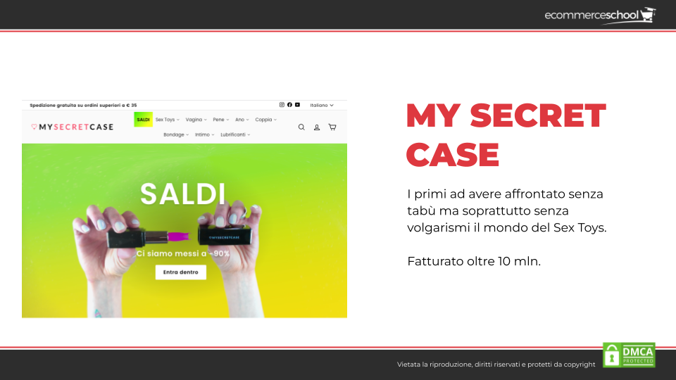 • My Secret Case, uno dei primi nel mondo a parlare di sex toys senza tabù e senza volgarità. Oggi, l’ecommerce ha un fatturato che supera i 10 milioni. Norma Rossetti, la fondatrice, ha dichiarato che il suo promo scopo è quello di normalizzare la sessualità, alla scoperta del corpo e di creare uno spazio accogliente, inclusivo e bodypositive.