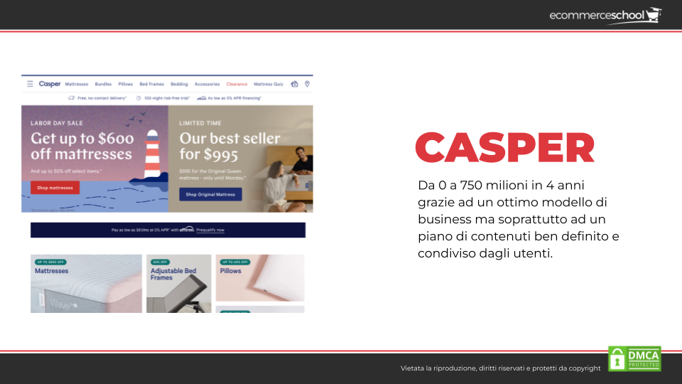 • Casper, un ecommerce di materassi che è passato da 0 a 750 milioni in soli 4 anni grazie a un ottimo modello di business e, soprattutto, grazie a un ottimo piano di Content Marketing che, oltre a essere ben definito, è anche condiviso e ricondiviso dagli utenti. Inoltre, hanno rilasciato anche molti studi con l’università, che gli ha permesso di aumentare di molto la loro authority.