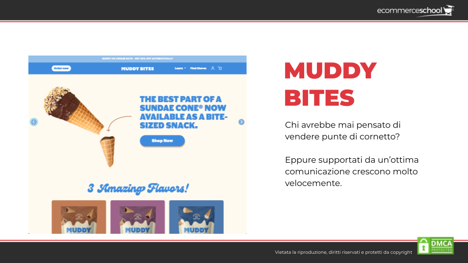 • Muddy Bites, un ecommerce che vende esclusivamente punte di cornetto gelato. Ci avresti mai pensato? Loro sì. E ci riescono perché sono supportati da un’ottima comunicazione, che gli permette di crescere molto velocemente.