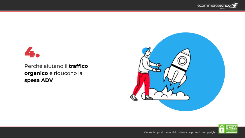 4. Aiutano il traffico organico e abbattono i costi di ADV. Questo vale anche per la SEO del sito internet, un concetto fondamentale che si consolida anche sui contenuti dell’ecommerce. Oggi sono ancora molti gli ecommerce che si basano, anche con spese importanti, sull’advertising. È giusto considerare il Content Marketing come una valida alternativa.