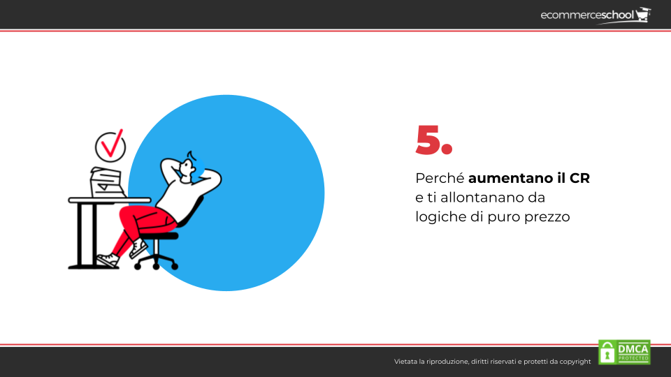 5. Aumentano il CR (Conversion Rate) e ti allontanano da alcune logiche legate puramente al prezzo. Dopo che i contenuti sono diventati rilevanti per la tua nicchia, potrai anche non preoccuparti più delle logiche di puro prezzo perché i tuoi utenti vorranno comprare da te anche se un tuo competitor ha un prezzo leggermente più basso, aumentando così anche il CR del tuo ecommerce.