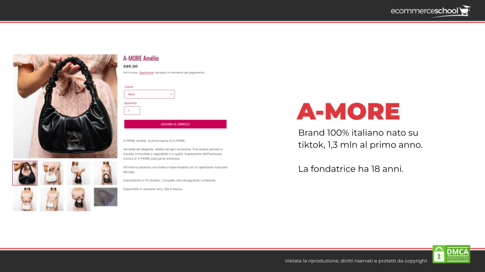 • A-more, un altro brand completamente italiano di accessori e abbigliamento. Nato su TikTok che ha fatturato 1,3 milioni al primo anno. La sua fondatrice ha 18 anni! Nonostante sia lei stessa a produrre i contenuti e nonostante la sua giovane età, ha avuto comunque la lungimiranza di produrre contenuti di format differente per ogni genere di canale utilizzato. Lungimiranza che molti ecommerce ancora non hanno.