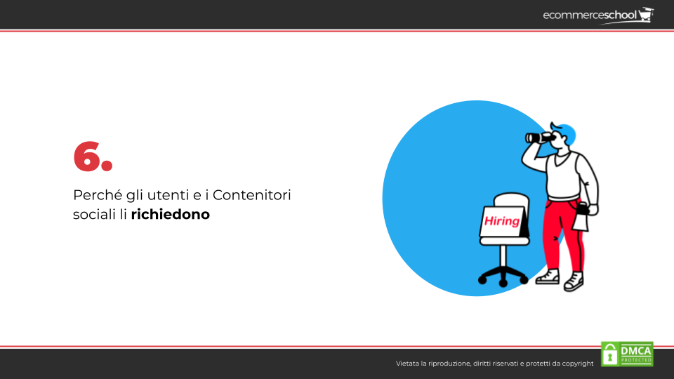 6. Sono necessari. I contenitori social, ovvero quei luoghi in cui la maggior parte delle persone si ritrova, oggi sono i social media. E questi necessitano di contenuti, anche se questi cambiano molto di più nel tempo. Una volta, ad esempio, si lavorava molto di più con contenuti testuali, oggi si lavora con piattaforme video-first come ad esempio TikTok.
