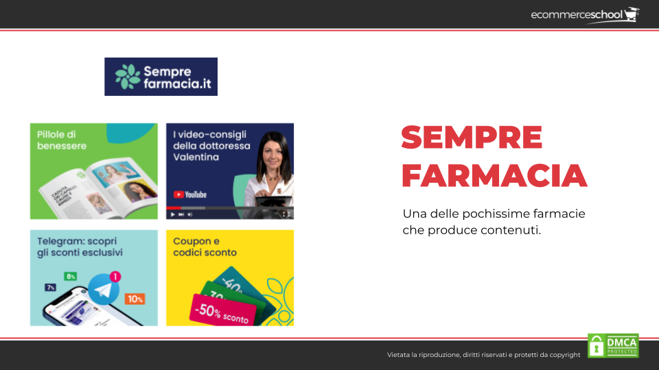 • Sempre farmacia, una delle pochissime farmacie online che produce contenuti nonostante non sia particolarmente grande. Sono bravi e hanno optato per non delegare all’esterno la produzione di contenuti; infatti, chi li crea è interno alla farmacia. Vanno a toccare diversi argomenti, con video di diverse tipologie ma che sono tutti realizzati con grande qualità.