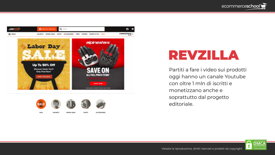 • Revzilla, ecommerce di abbigliamento da moto, che è partito realizzando video sui prodotti e oggi hanno un canale YouTube con oltre 1 milione di iscritti. Canale che gli permette di monetizzare anche e soprattutto dal progetto editoriale. Si tratta di un competitor di Motoabbigliamento.