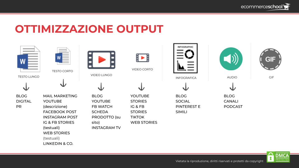 Si può, per esempio, realizzare un testo molto lungo che viene utilizzato nel blog. Da questo estrapolare il contenuto per l’email marketing e per i post dei social, poi lo si può trasformare nello script di un video per YouTube che, se realizzato bene può essere accorciato per i contenuti video dei social e così via, coinvolgendo anche i Podcast