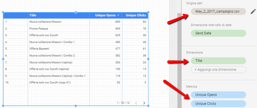 Una volta caricato, ti sarà possibile elaborare grafici come meglio credi a partire da quella base dati. Nell’esempio sotto, ho creato una semplice tabella a partire per visualizzare Open Rate e Click Rate di ciascuna campagna email: