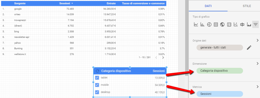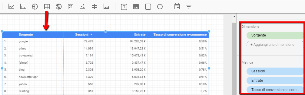 Nell’esempio sopra ho selezionato come Dimensione “Sorgente”  e come metriche “Sessioni”, “Entrate” e “Tasso di conversione”.