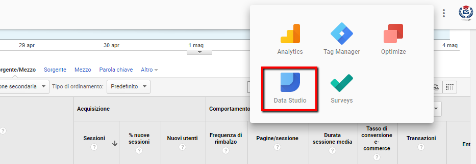 Se non ci hai ancora fatto caso, trovi Datastudio nella sezione “App” di Google Analytics, in alto a destra.