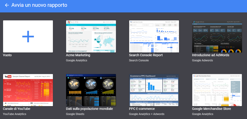 Una volta entrato in Datastudio potrai decidere se iniziare un nuovo rapporto vuoto oppure iniziare da uno dei bellissimi template che offre: