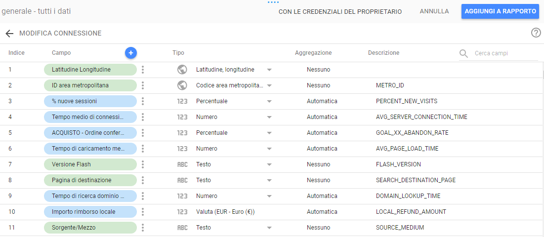 Nella sidebar di destra trovi tutte le dimensioni e metriche del tuo Analytics per personalizzare la tabella con i dati di tuo piacimento.