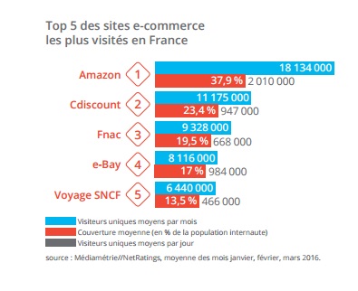 Infine, il capostipite dei marketplaces è Amazon con un totale di 18 milioni di visite uniche al mese. A seguire, poi si trovano Cdiscount, il sito della Fnac, eBay e la grande distribuzione con Carrefour.