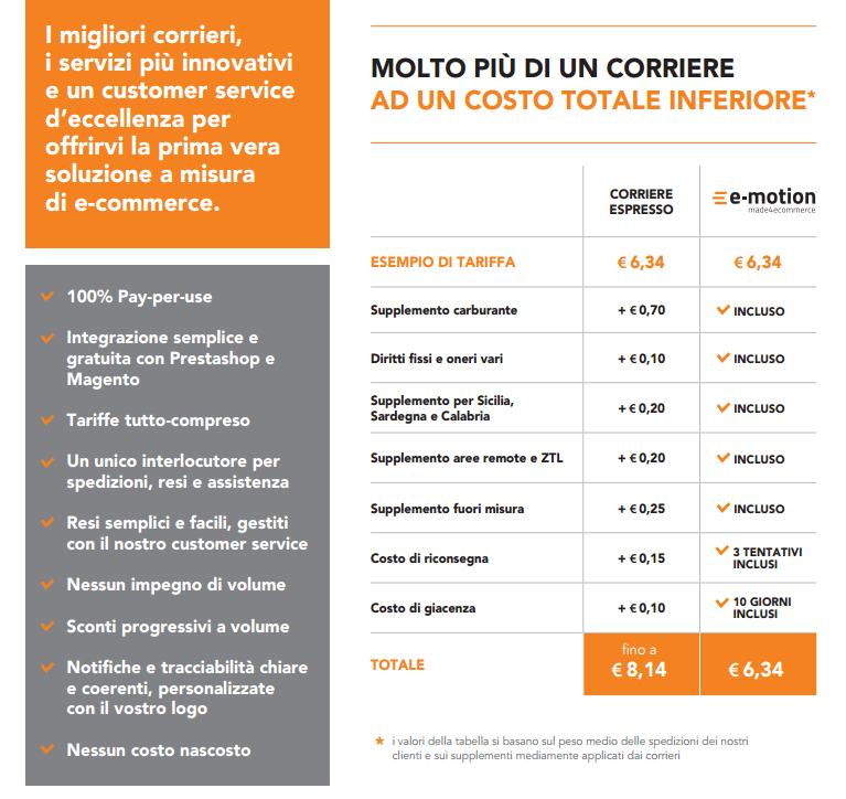 E-motion Spedizioni Ecommerce fa parte di un gruppo molto conosciuto nel territorio nazionale (non è un corriere espresso) ed offre l’outsourcing totale della spedizione a prezzi concorrenziali e trasparenti.