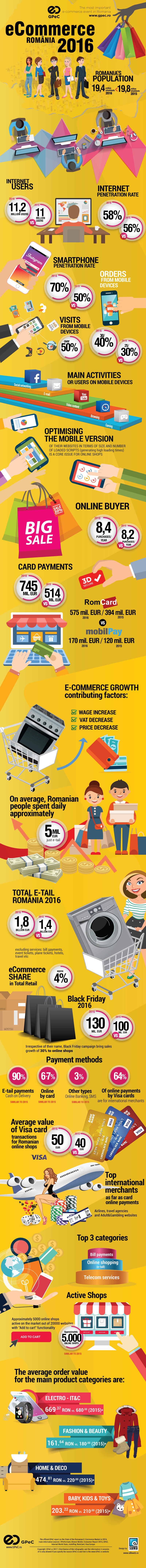 L’evento rumeno sull’ecommerce GPeC ha pubblicato nel 2016 un rapporto e un’infografica sul mercato nazionale. Secondo questo report e secondo alcuni importanti market places, il valore della dimensione del mercato ecommerce rumeno (contando solo i beni materiali venduti online) è superiore a 1,8 miliardi di euro, mostrando un aumento del 30% rispetto al 2015.