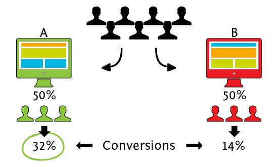 In pratica, attraverso appositi software (tra i più famosi ti segnalo Visual Website Optimizer e Optimizely) crei due versioni di una stessa pagina (versione A e versione B). In maniera casuale, il software indirizzerà il 50% dei visitatori verso la pagina A, l'altro 50 % verso la pagina B.