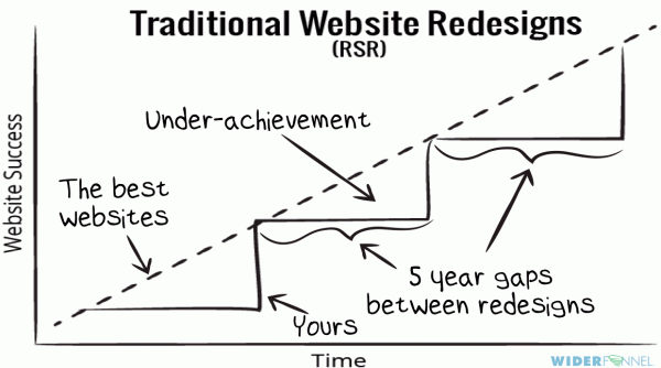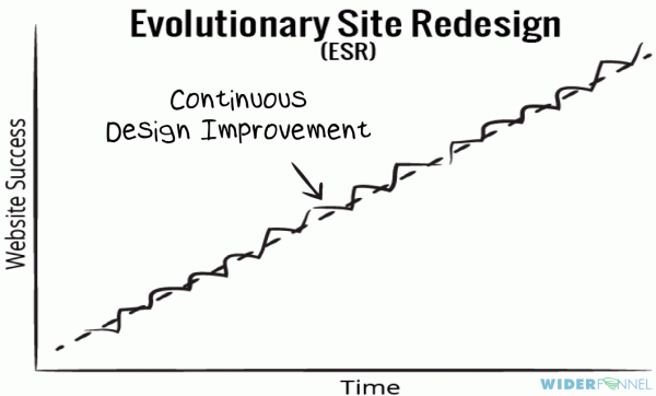 In questo modo potrai effettuare quello che Chris Goward di WiderFunnel chiama "Redesign Evoluzionistico": un continuo e graduale perfezionamento di singoli elementi nelle tue pagine, capace di portare ad un costante aumento delle conversioni.