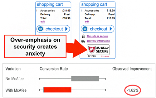 Dato che gli acquisti online sono fonte di incertezza, solitamente è buona regola inserire dei badge di sicurezza accanto o sotto le call to action, per ricordare ai visitatori che il sito in questione è sicuro. Questo è vero in molti casi, ma attenzione a farne una regola universale.