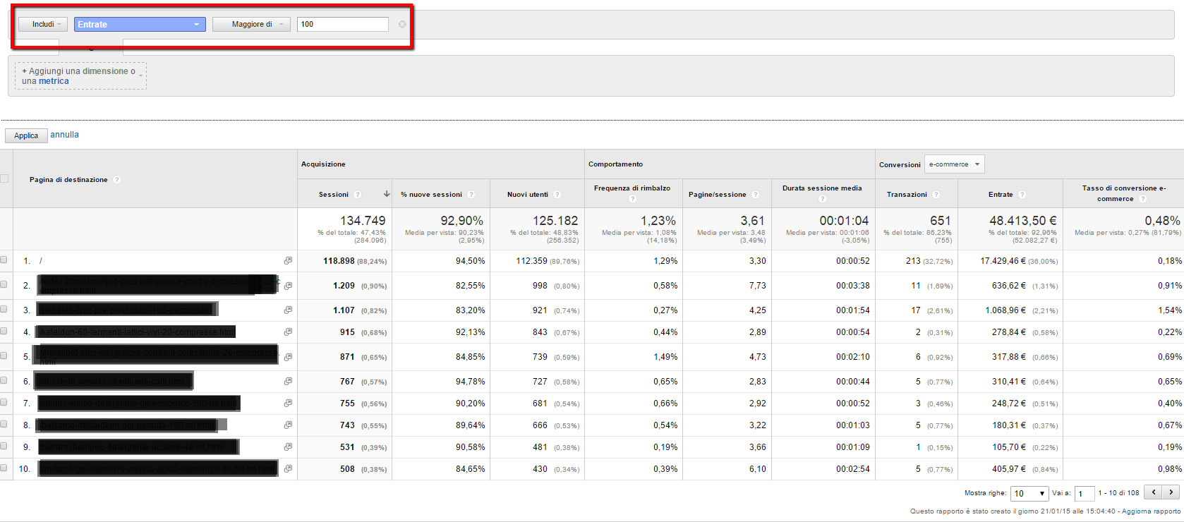 Se vuoi fare A/B test per ecommerce su pagine direttamente collegate alla vendita, come le schede prodotto, ti consiglio di impostare un filtro per visualizzare solo le pagine che generano un certo fatturato: