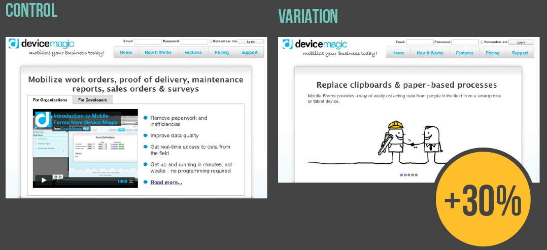 Per DeviceMagic la sostituzione di un video + bullet points con 5 slides rotanti ha comportato un aumento delle conversioni del 30%!