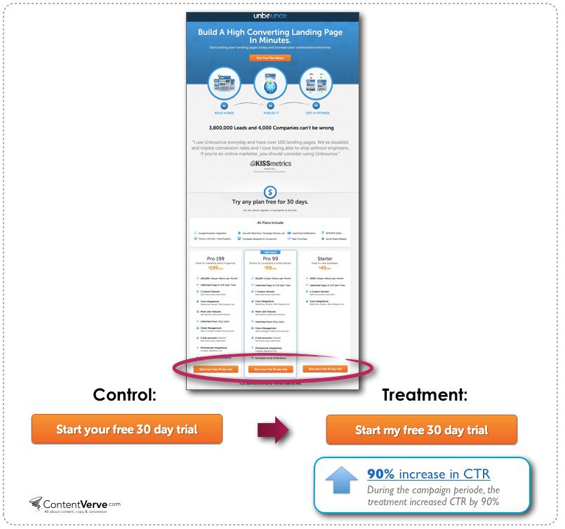 La landing page di Unbounce ha avuto un aumento delle conversioni del 90%, solamente cambiando il testo della call to action dalla seconda persona alla prima persona singolare!
