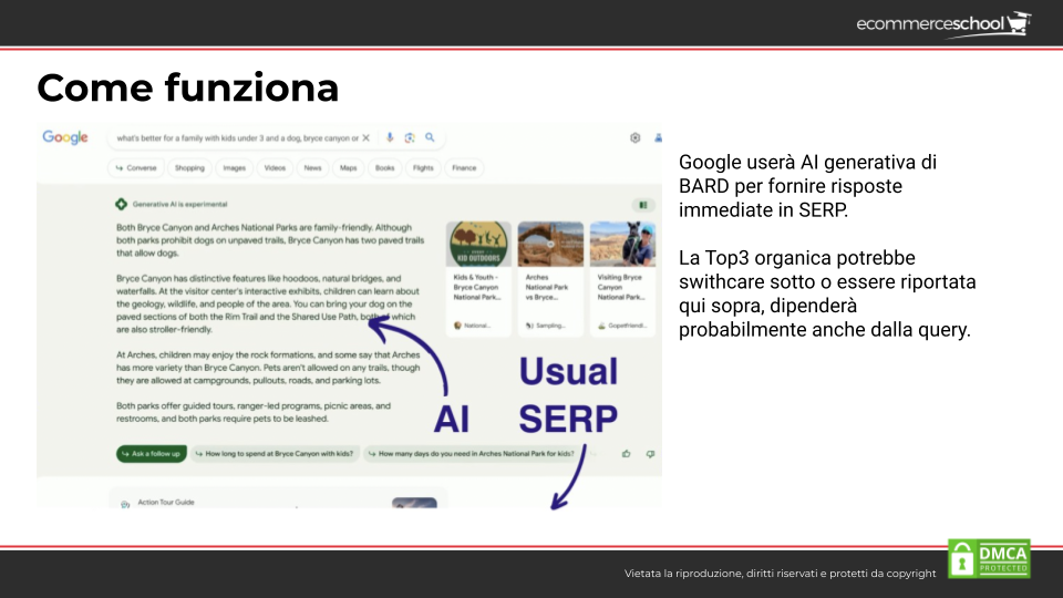 Una vera rivoluzione è in arrivo: Google, da motore di ricerca, diventa motore di risposta. Di conseguenza, cambia anche il modo di ricercare degli utenti. Ovviamente non si attiverà per tutte le SERP: più la domanda sarà specifica più si attiveranno suggerimenti di risposta. E la differenza rispetto a Bing AI è che il sistema è integrato direttamente nella Search.