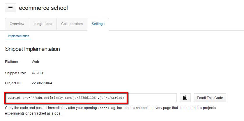 Una volta effettuata la registrazione ed entrato nella dashboard di Optimizely, devi mettere in contatto la piattaforma con il tuo sito web. Vai alla voce “Settings” e copia il codice di implementazione. Lo dovrai incollare nell’html delle pagine che intendi monitorare, subito prima della fine della sezione <head>.