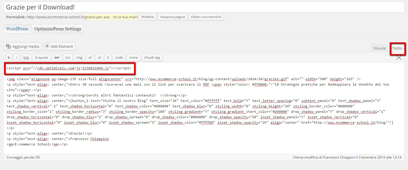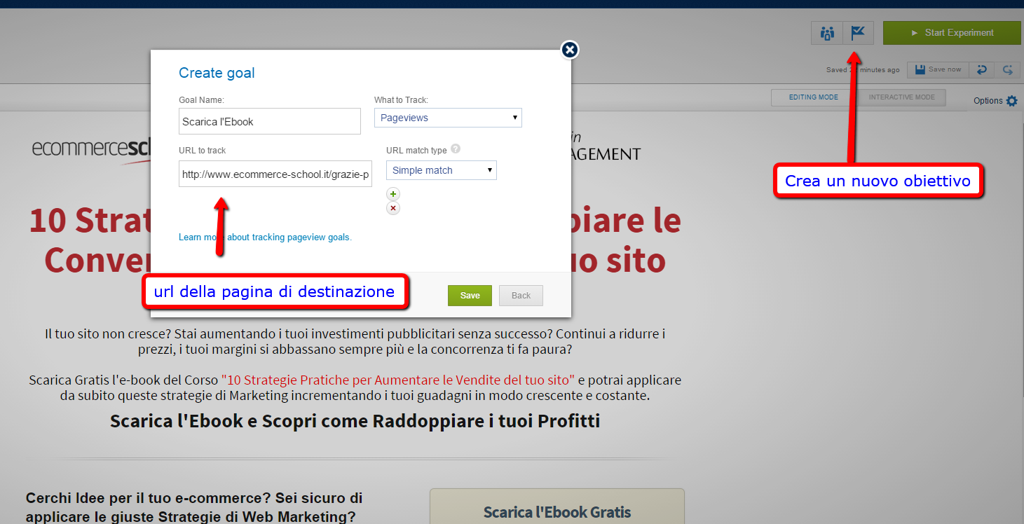 Nell'esempio seguente, ho deciso di creare una variazione nel copywriting del Titolo della landing page all'indirizzo www.ecommerce-school.it. Quella pagina di atterraggio ci serve per fare lead generation.