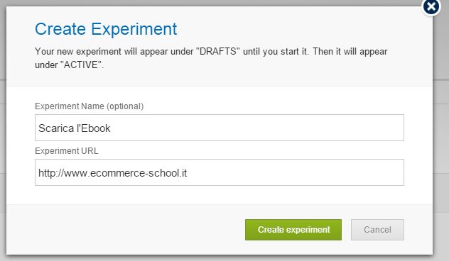 Una volta inserito il codice di monitoraggio sul tuo sito, torna alla dashboard di Optimizely e clicca sul pulsante verde "Create new experiment". Dovrai inserire l'URL della pagina in cui intendi effettuare l'esperimento.