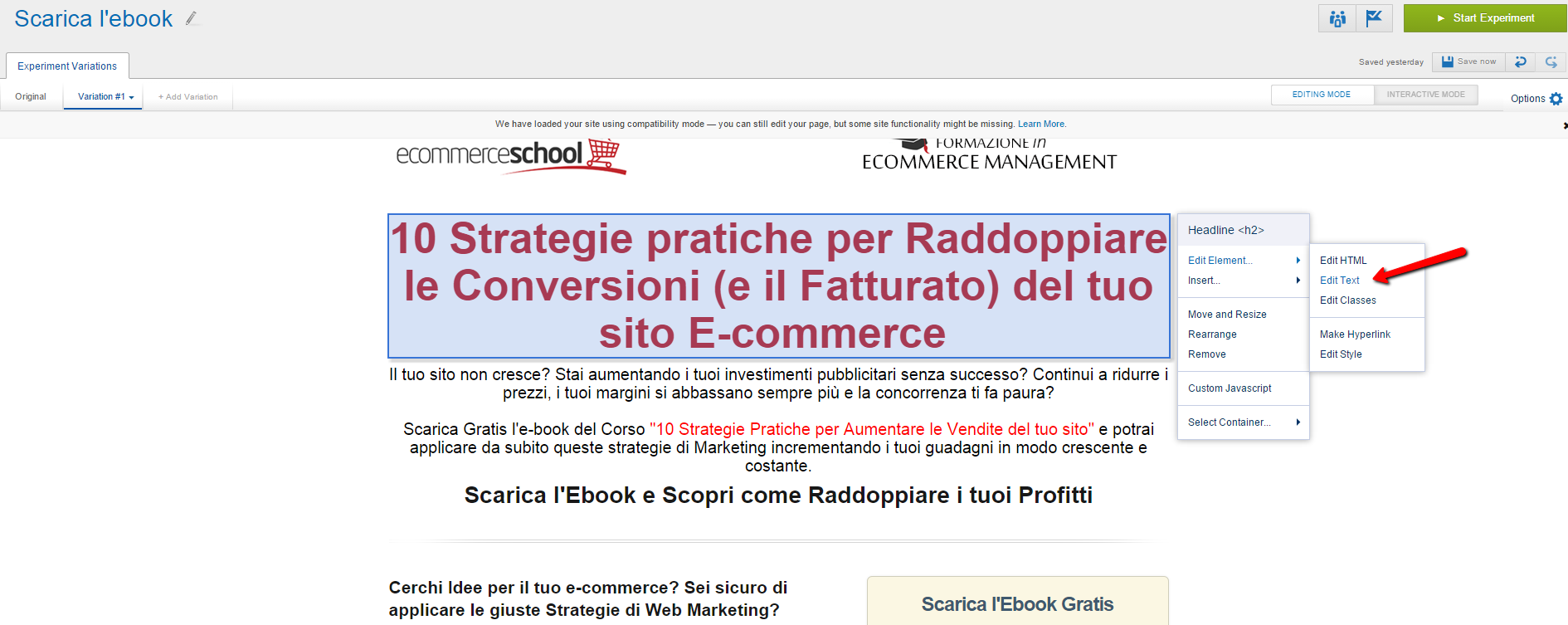 Come puoi vedere, nell'editor visuale di Optimizely è davvero semplice selezionare un qualsiasi elemento e modificarlo. Nel mio caso clicco sul titolo H1 e seleziono "Edit Element" => "Edit Text" ed inserisco una variazione del titolo, da