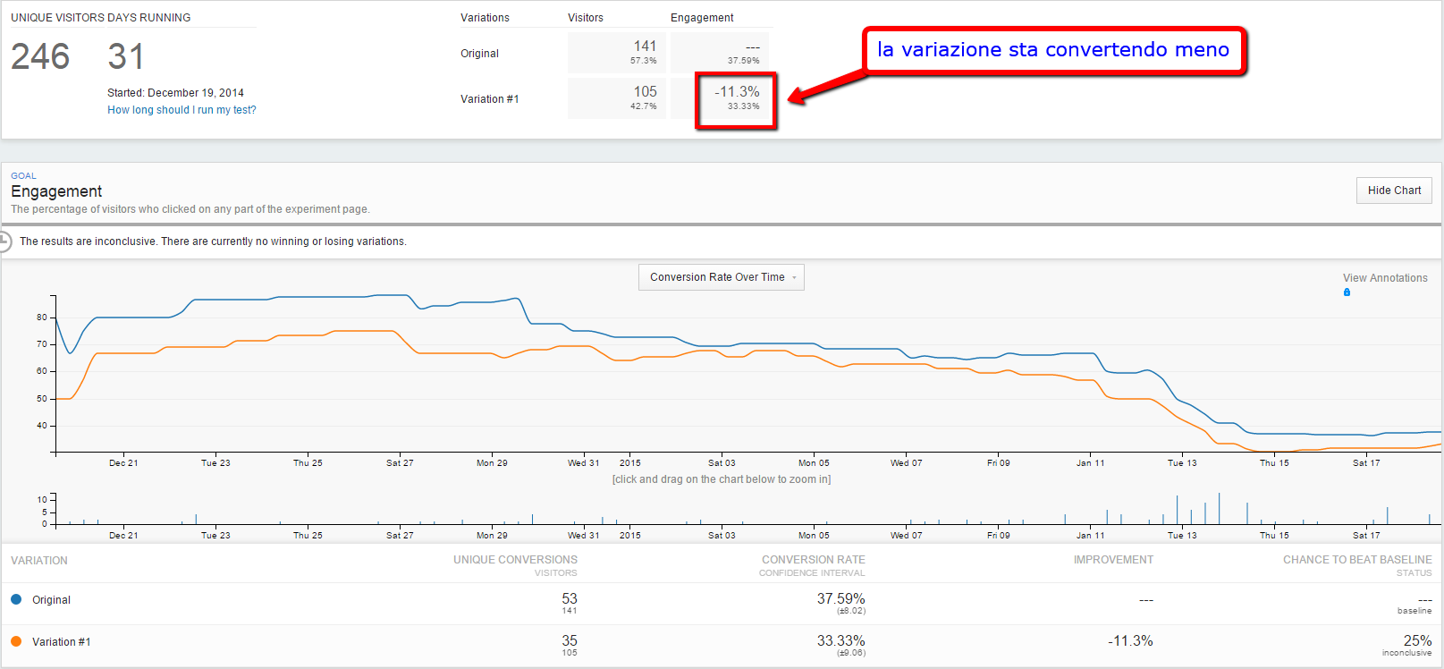 Nel caso della landing page di Ecommerce-school, come vedi la versione originale sta vincendo sulla Variazione con un punteggio di (53 conversioni / 141 visualizzazioni) vs (35 conversioni / 105 visualizzazioni). Ma la rilevanza statistica è di solo il 25% e la strada è ancora lunga prima di scegliere un vincitore!