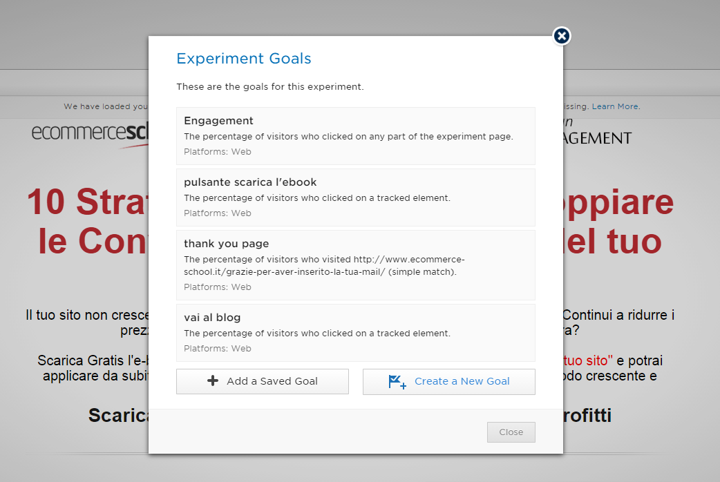 Di default Optimizely ti offre l'obiettivo preimpostato "Engagement", che personalmente considero molto efficace. In pratica l'obiettivo si verifica ogni volta che uno qualsiasi tra i link presenti nella pagina viene cliccato.