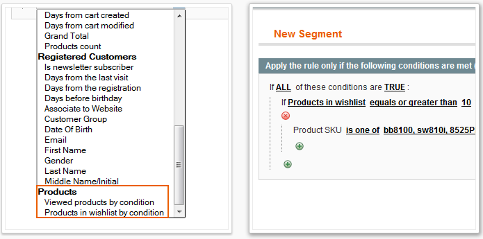 Nell’immagine sotto, il segmento viene creato a partire dai prodotti inseriti in Whishlist: